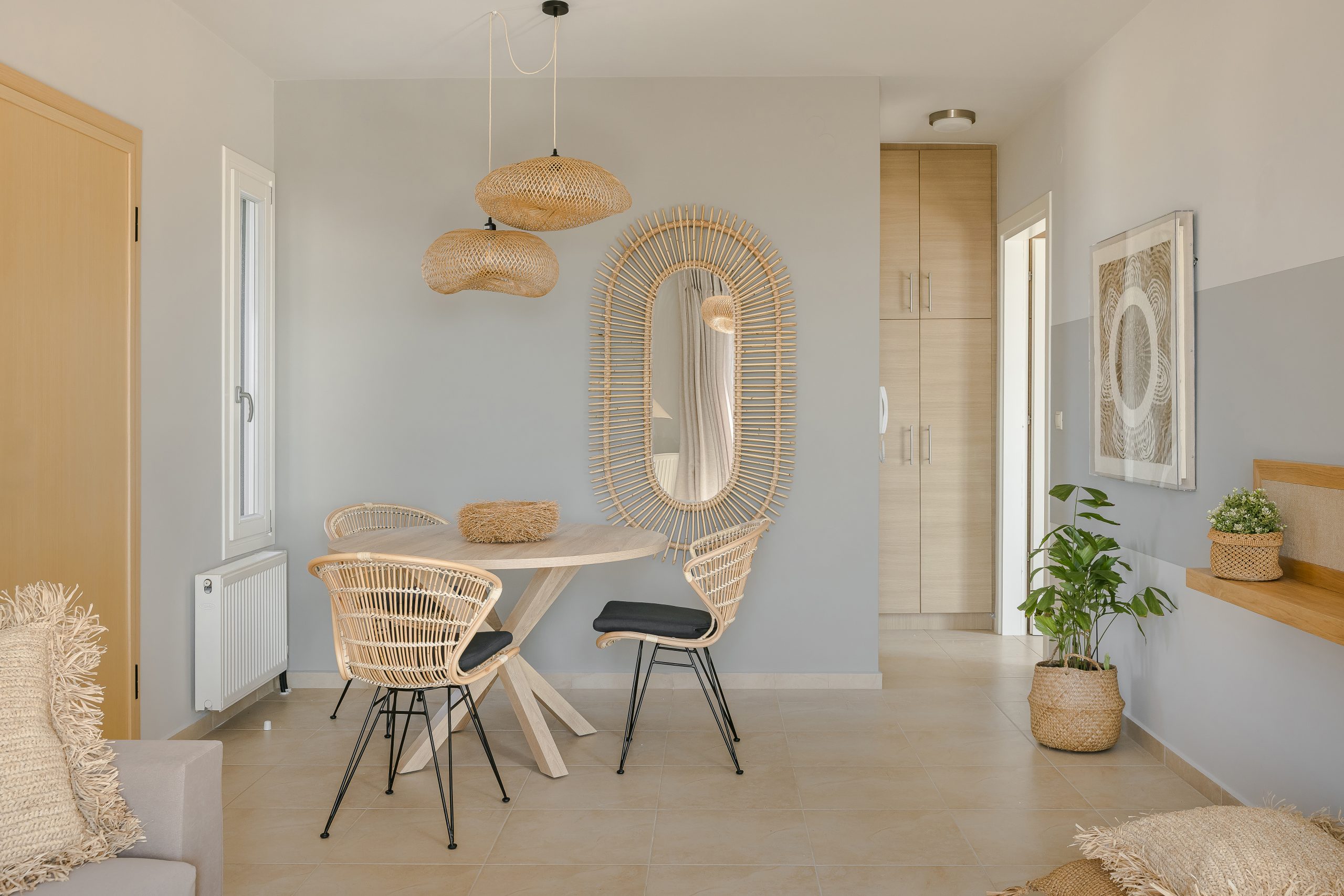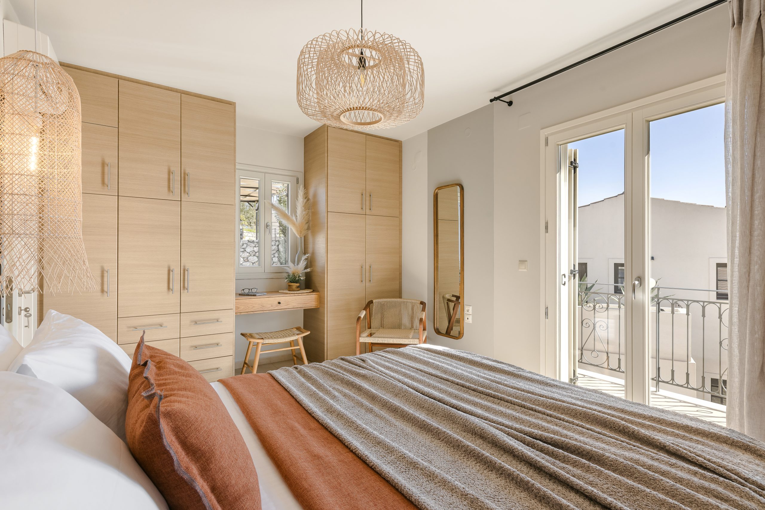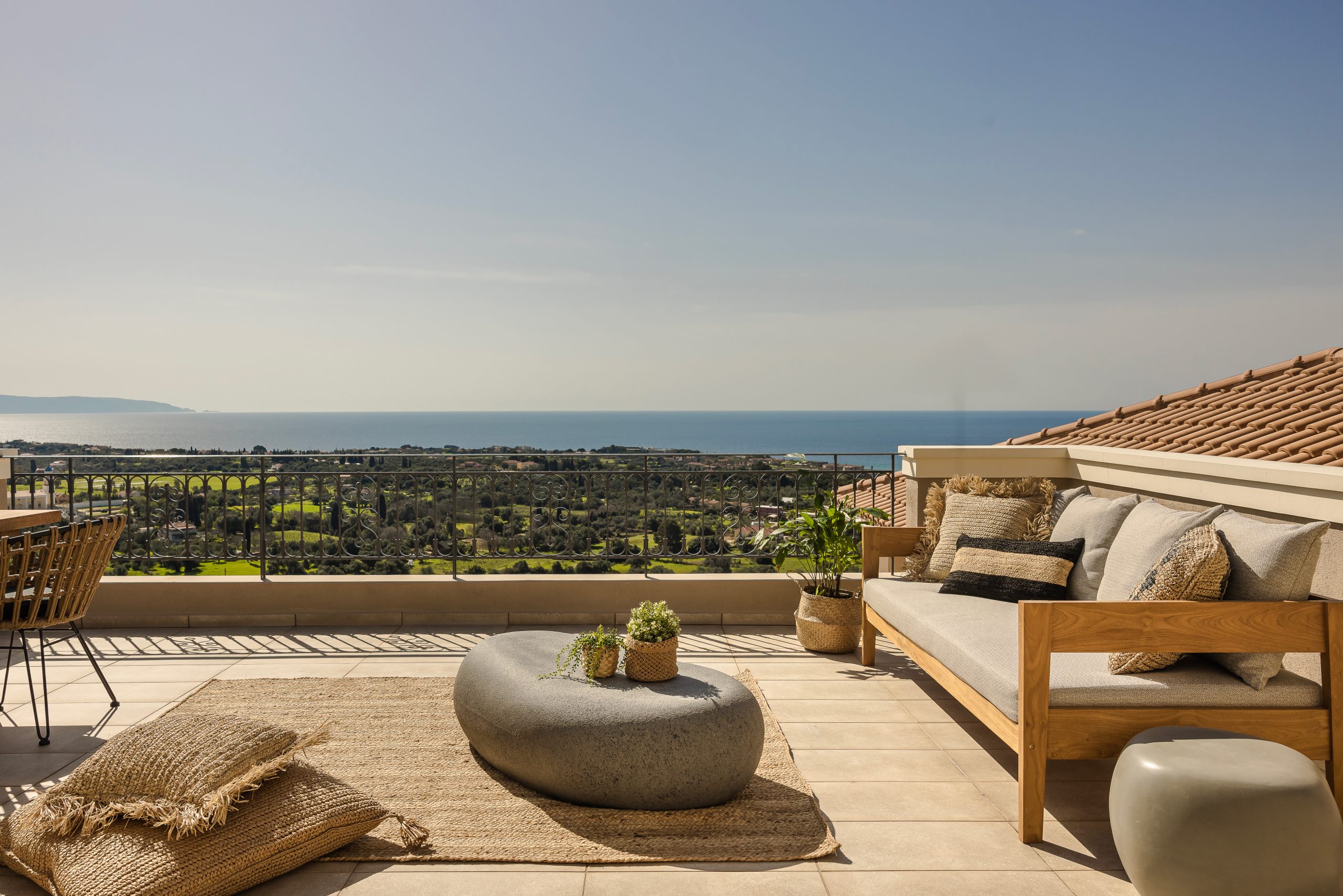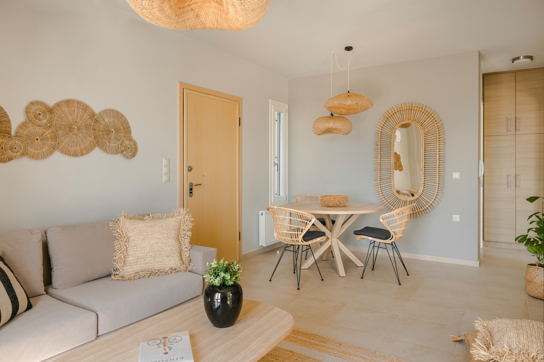 At 65 m², Eos is a thoughtfully designed one-bedroom residence featuring a spacious living area, private bathroom, and fully equipped kitchen. The bedroom includes a large double bed with ample storage, while the open-plan layout connects to a sea-view terrace, garden-facing patio, and an inviting indoor seating area.